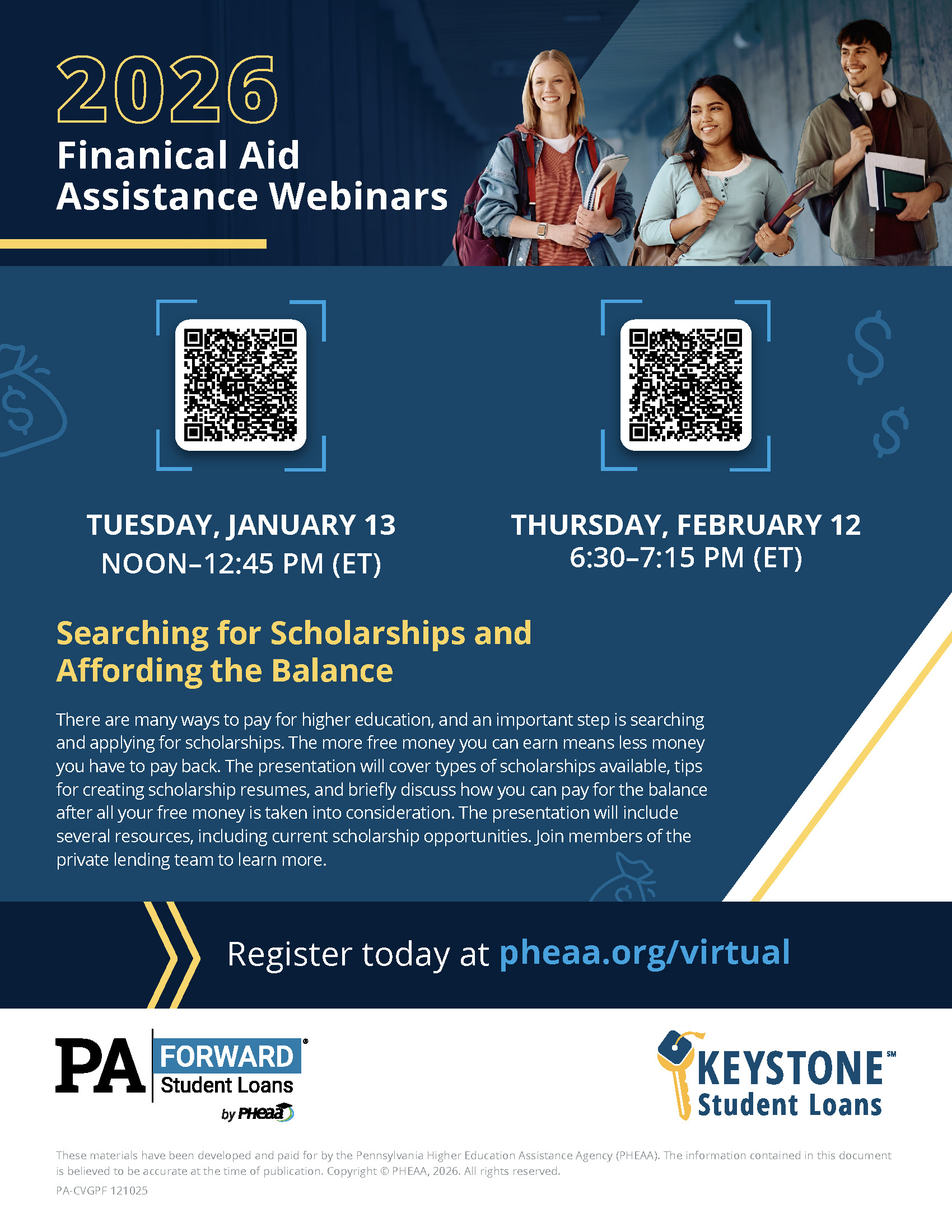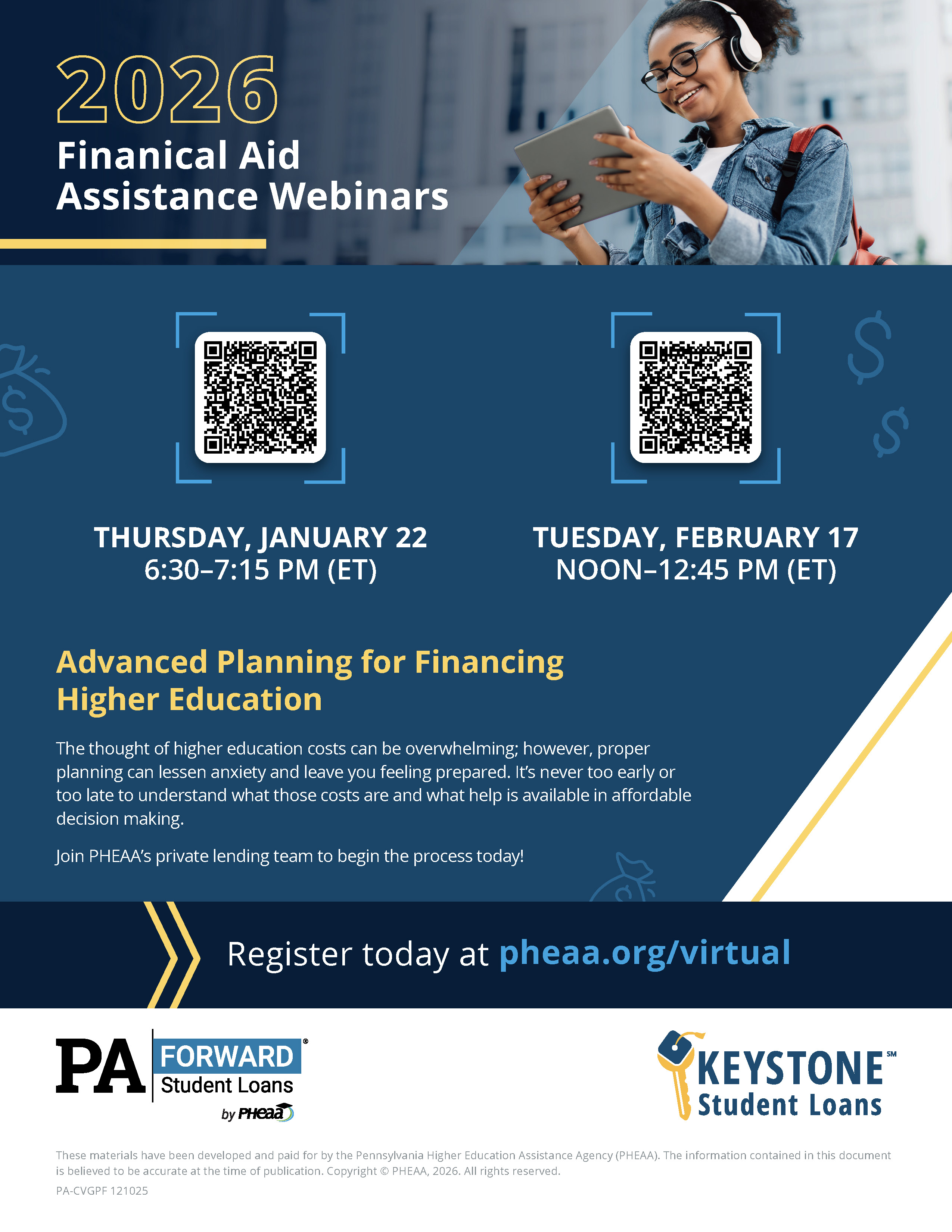 Start planning now for your student’s higher education with PHEAA! Check out the flyers for PHEAA’s upcoming January and February Financial Aid Literacy Webinars. Searching for Scholarships covers the types of scholarships available, tips for standing out, and current scholarship opportunities. Advanced Planning for Financing Higher Education spans resources available from Elementary into High School.