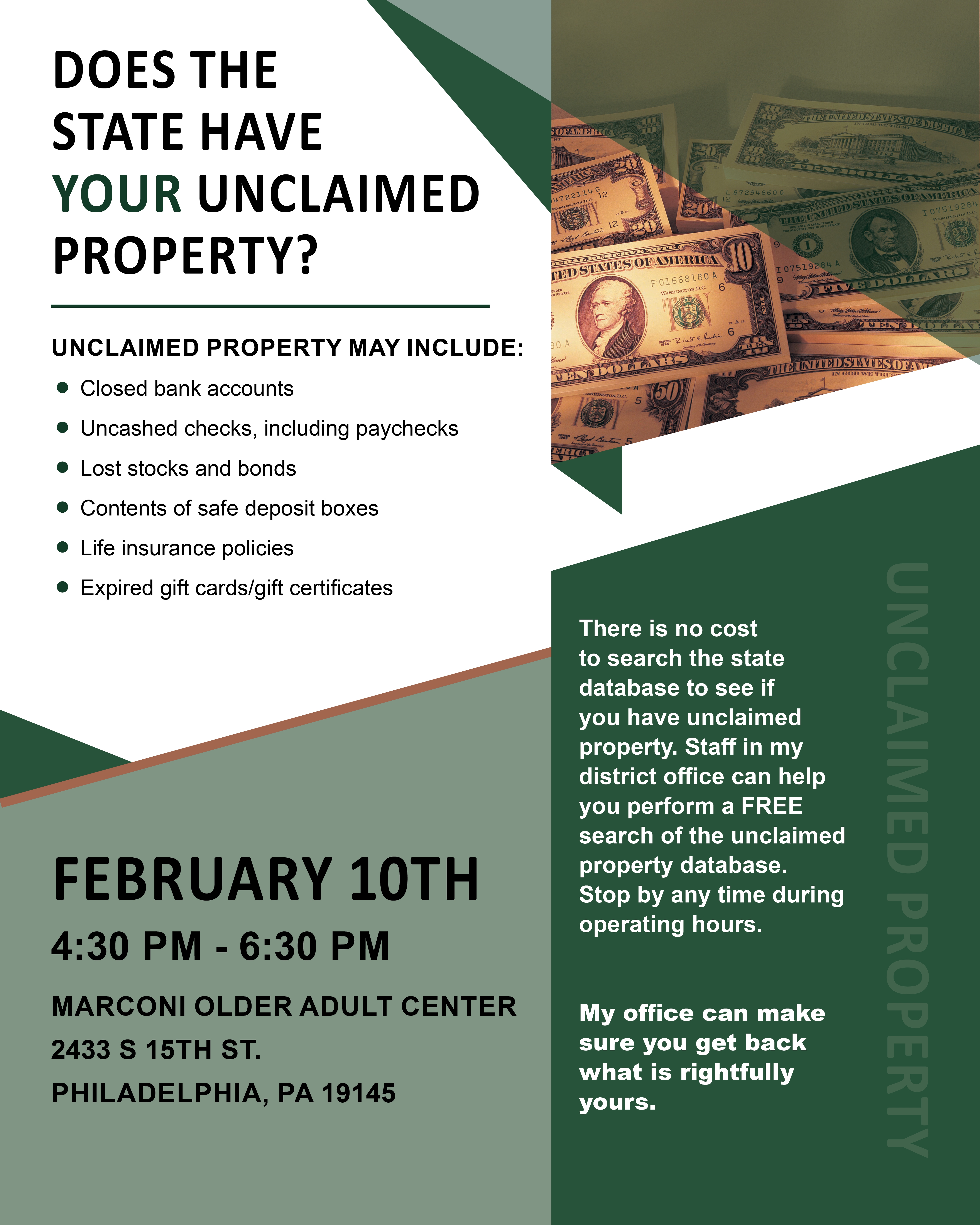The state might have unclaimed property IN YOUR NAME just waiting in the state vault to be claimed. Come to my Unclaimed Property workshop on Thursday, Feb. 10 from 4:30 p.m. until 6:30 p.m. at the Marconi Older Adult Center, 2433 South 15th Street. We’ll be able to search your name to see if there’s anything that belongs to you, from uncashed checks to antiques or anything in between. Let us help you get back what is rightfully yours.