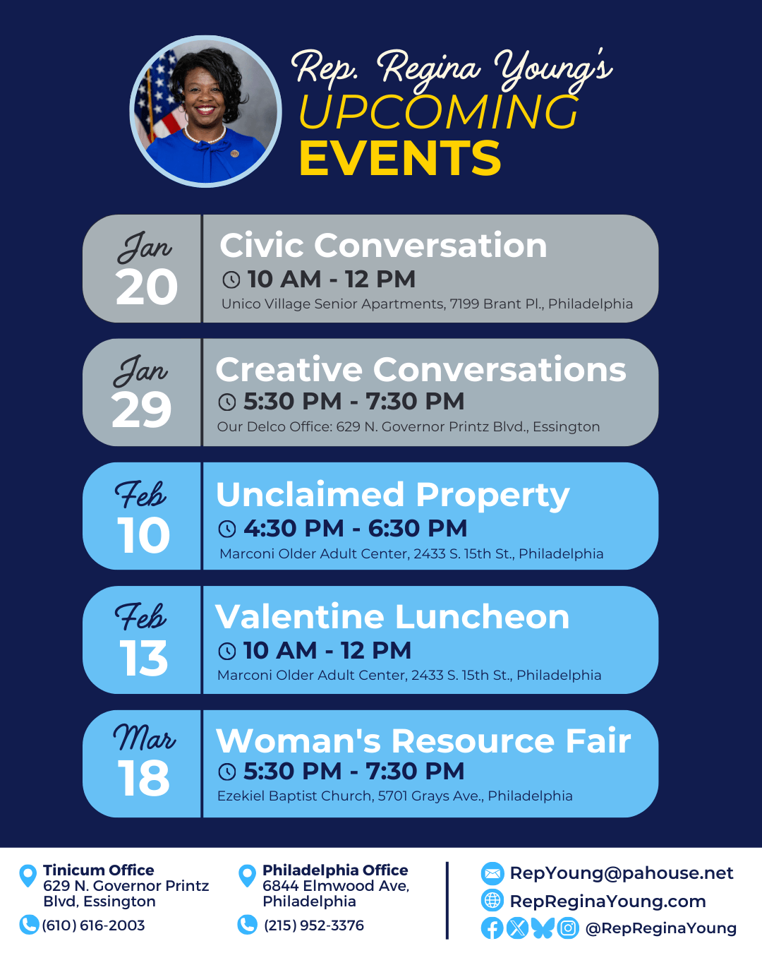 And save the date for all my upcoming events in the community! Watch this e-newsletter and my social media for details or contact one of my offices!
